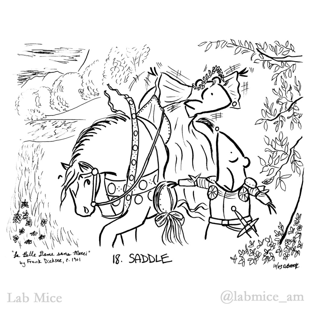This is based on the painting La Belle Dame Sans Merci by Frank Dicksee, from about 1901. It, in turn, is based on a poem by the same name by John Keats, in which a fairy beguiles a knight and leads him to his doom. So maybe don’t feel too bad for the predicament of our leading lady.