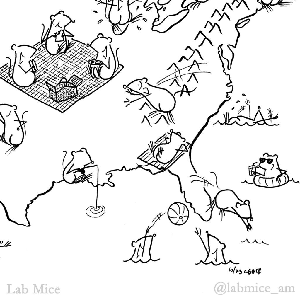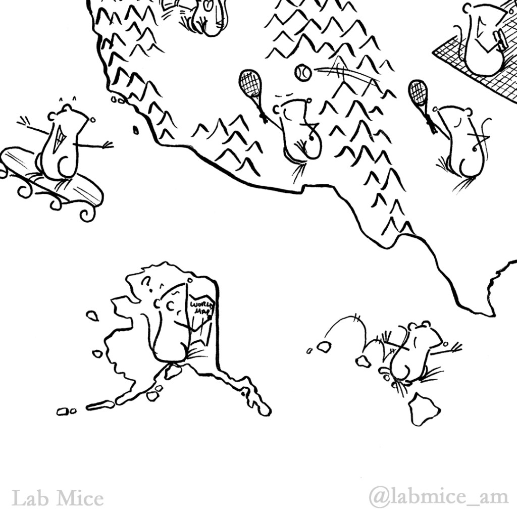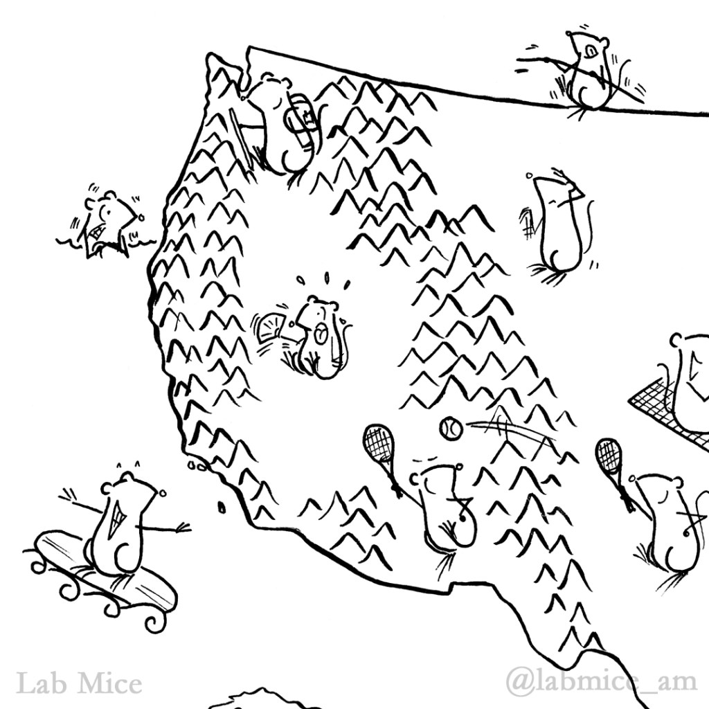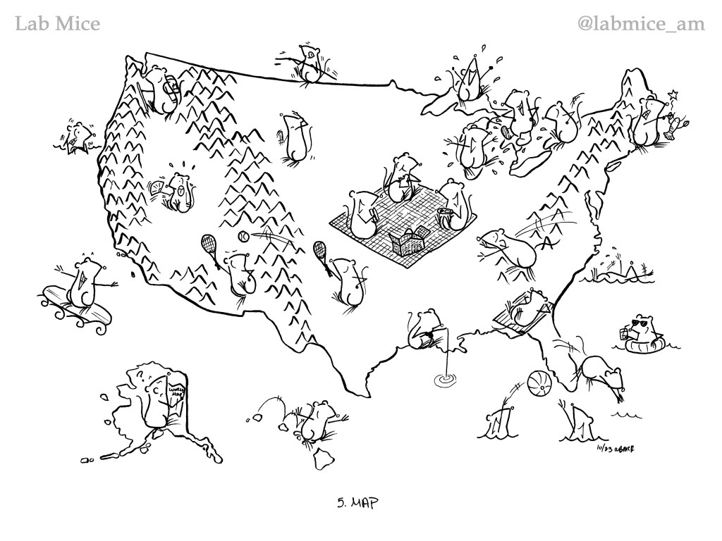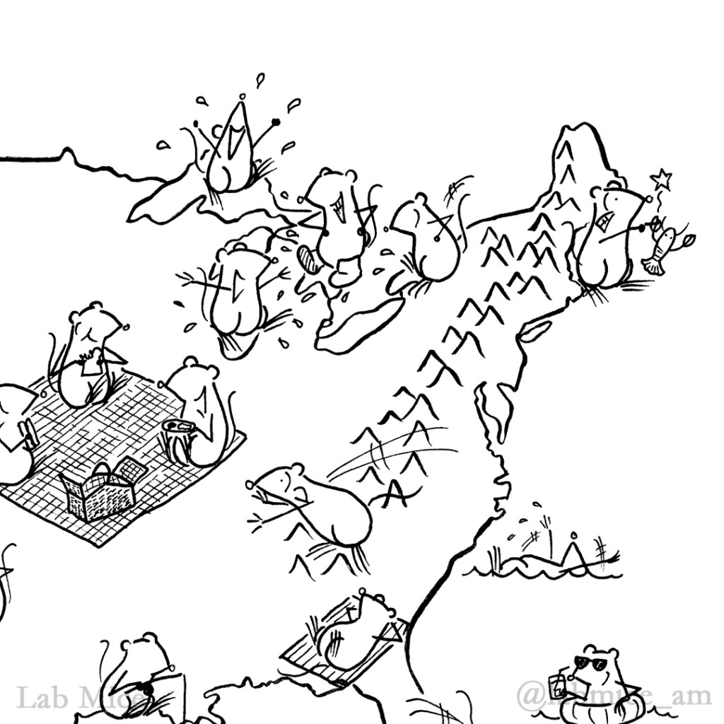 I love drawing a big group of mice scurrying around doing different things, and this was so much fun! Putting in the mountain ranges reminded me very much of filling in geography maps in school.
