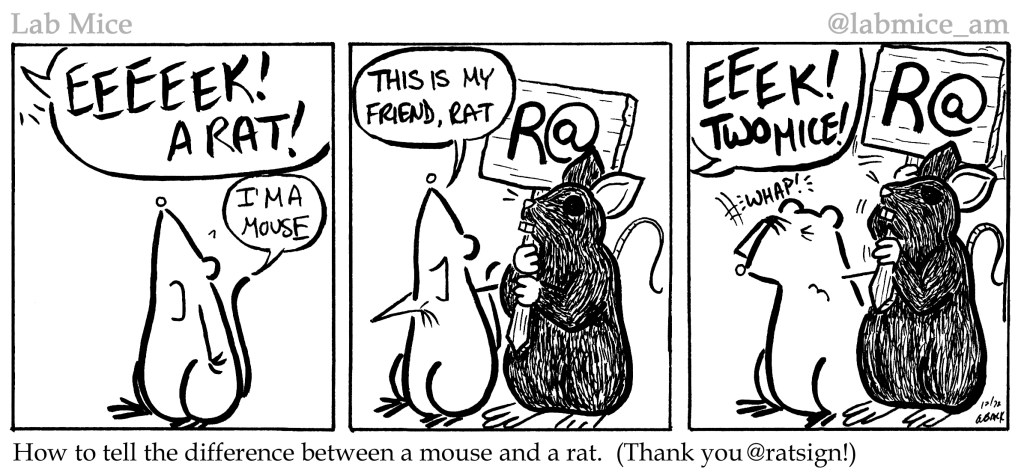 Thanks to @ratsign on Instagram for letting me borrow his character for a comic! Go check out his amazing miniature artwork–you might spot a Lab Mouse hanging out with a buddy! (And you’ll see why I sweated over drawing R@ just right).