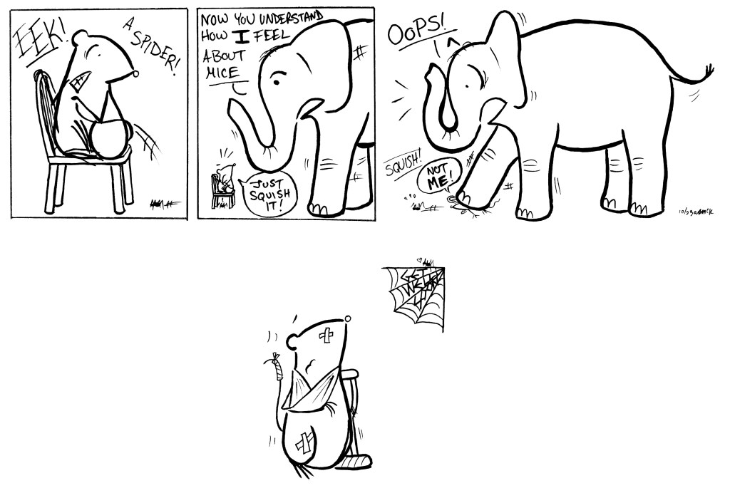 In the very first Lab Mice drawings (a series of doodles on a high school biology quiz), a mouse met an elephant, who panicked (“elephants are afraid of mice”) and inadvertently squished the mouse. The mouse reappeared in a body cast, the elephant apologized, and the two agreed to be friends. And then Elephant almost never appeared again. So here she is, 18 years later! Does a character count as “recurring” if she’s only seen about once every decade?